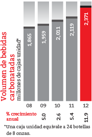 En 2012, generamos un crecimiento orgánico sólido. Excluyendo los resultados de los territorios recientemente fusionados de Grupo Tampico, Grupo CIMSA y Grupo Fomento Queretano, los ingresos y la utilidad de operación aumentaron 11.6% y 13.3%, respectivamente. Los principales impulsores de este desempeño favorable en el año fueron: la capacidad para aprovechar nuestro nuevo esquema comercial y captar así las oportunidades de valor de nuestra industria a través de nuestra ejecución en el punto de venta, nuestra habilidad para maximizar los ingresos mediante un manejo segmentado del portafolio, y la fortaleza de nuestro portafolio de bebidas multicategoría.