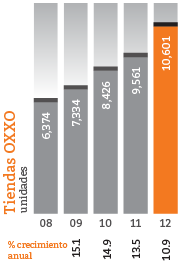 Además del crecimiento de las ventas de tiendas comparables, continuamos consolidando nuestra posición de liderazgo como la cadena de tiendas de formato pequeño más grande y de más rápido crecimiento en América Latina. En 2012, superamos la cifra de 10,000 tiendas con la apertura de 1,040 nuevos establecimientos, para sumar 10,601 tiendas. También seguimos adelante en Colombia, donde continuamos avanzando hacia una propuesta de valor adecuada para nuestras tiendas, ajustando y probando variables tales como tamaño, formato, diseño, ubicación y surtido. A medida que avanzamos en el conocimiento de este prometedor mercado, vamos expandiendo gradualmente nuestra red de tiendas en Bogotá, de 21 al final de 2011 a 34 al cierre de 2012.