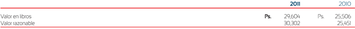 El valor razonable de los pasivos bancarios de largo plazo se determina con el valor de los flujos descontados. La tasa de descuento aplicada se estima utilizando las tasas actuales ofrecidas para deudas con montos y vencimientos similares. El valor razonable de los documentos por pagar se determina con base en los precios de cotización del mercado.