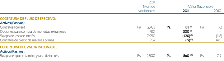 La Compañía tiene contratos denominados swaps de tasa de interés y de tipo de cambio, con la finalidad de administrar el riesgo de las tasas de interés y la fluctuación cambiaria de sus créditos denominados en dólares y en otras monedas, los cuales son reconocidos en el estado de situación financiera consolidado a su valor razonable estimado. Este valor se estima tomando como base modelos técnicos formales. Estos contratos han sido designados como de cobertura de valor razonable. Los cambios en el valor de mercado del derivado se registran como parte de la porción inefectiva de instrumentos derivados, netos de los cambios de valor de mercado del pasivo de largo plazo al cual están asignados.