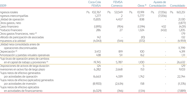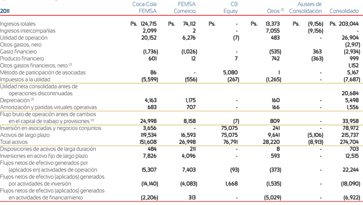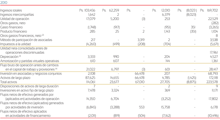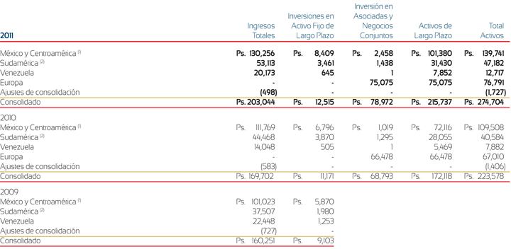 (2) Sudamérica incluye Brasil, Argentina, Colombia y Venezuela, aunque en las tablas presentadas arriba Venezuela se muestra por separado. Los ingresos de Sudamérica inlcuyen ingresos de Brasil de Ps. 31,405, Ps. 27,070 y Ps. 21,465 durante los años terminados el 31 de diciembre de 2011, 2010 y 2009, respectivamente. Los activos de largo plazo de Brasil fueron de Ps. 15,618 y Ps. 14,410 al 31 de diciembre de 2011 y 2010, respectivamente. Los ingresos de Sudamérica también incluyen ingresos de Colombia de Ps. 12,320, Ps. 11,057 y Ps. 9,904 durante los años terminados el 31 de diciembre de 2011, 2010 y 2009, respectivamente. Los activos de largo plazo de Colombia fueron de Ps. 12,855 y Ps. 11,176 al 31 de diciembre de 2011 y 2010, respectivamente.