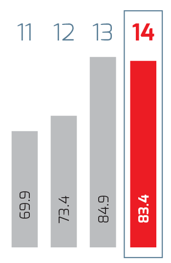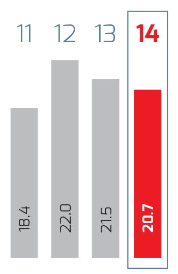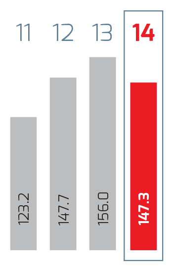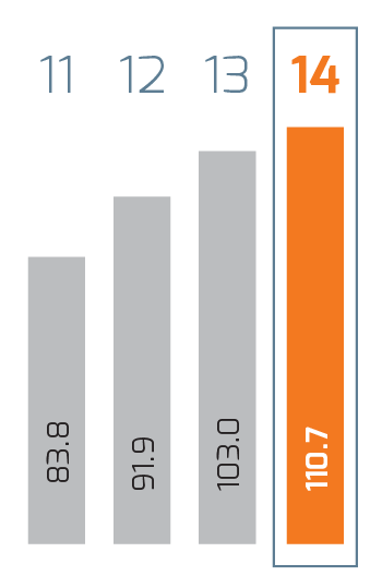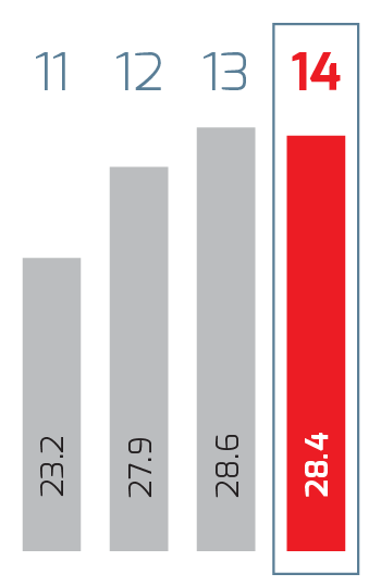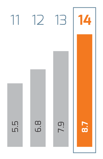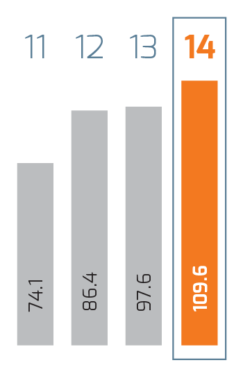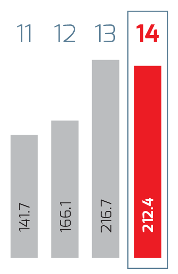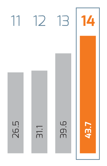 | Millones de pesos | 2014 1 | 2014 | 2013 | % Cambio | 2012 | % Cambio | 2011 2 |