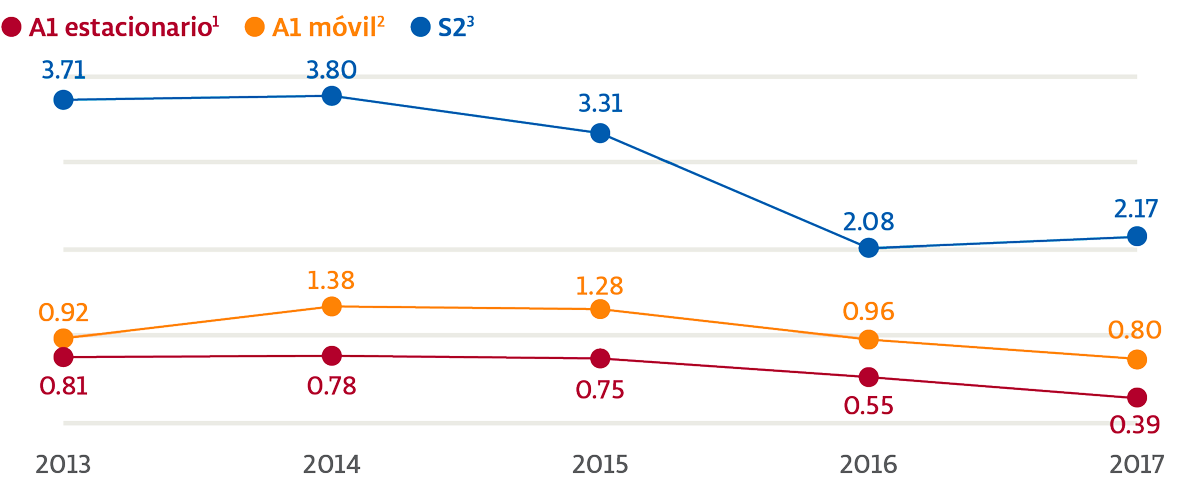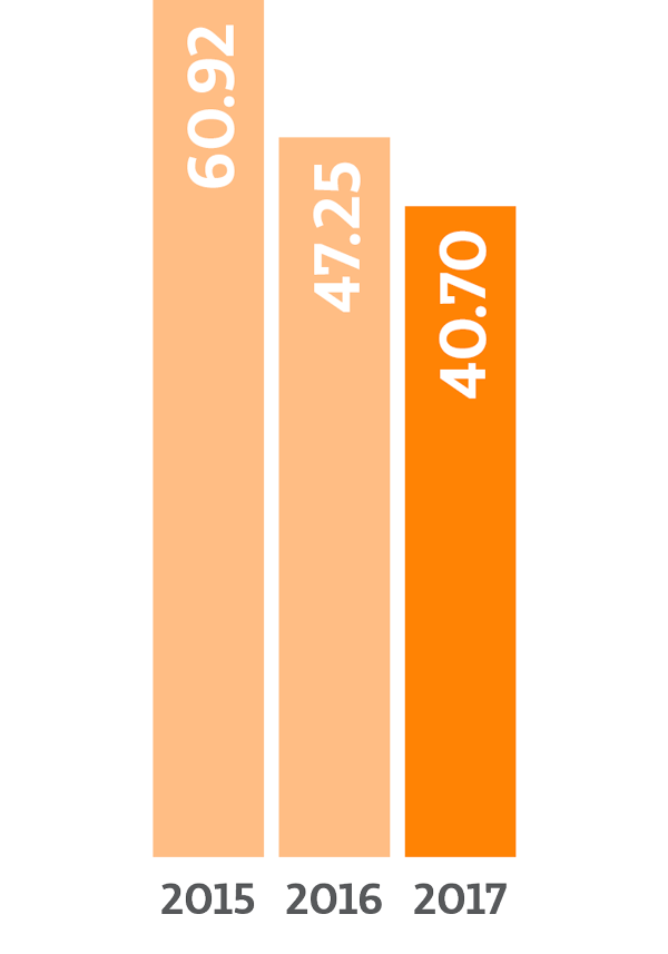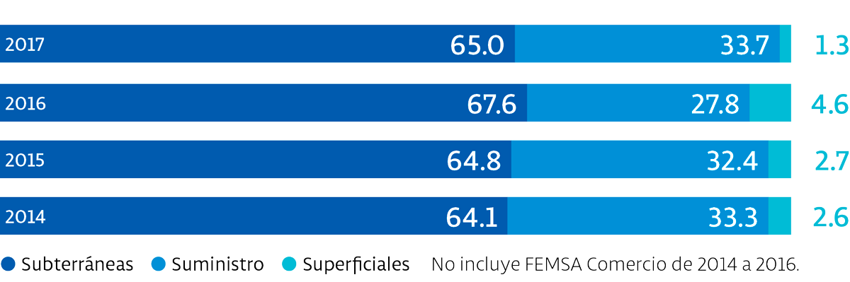 También buscamos optimizar el uso de los combustibles que empleamos en nuestras operaciones. Por ejemplo, hemos reducido el consumo por kilómetro recorrido en nuestras operaciones de Solistica implementando una planeación eficiente de rutas e integrando nuevas tecnologías. Con estas medidas, entre 2011 y 2016 se evitó la liberación a la atmósfera de 729,370 toneladas de emisiones de CO2. La eficiencia en el uso de nuestro combustible en México en 2017 fue de 0.51 km recorrido por litro.