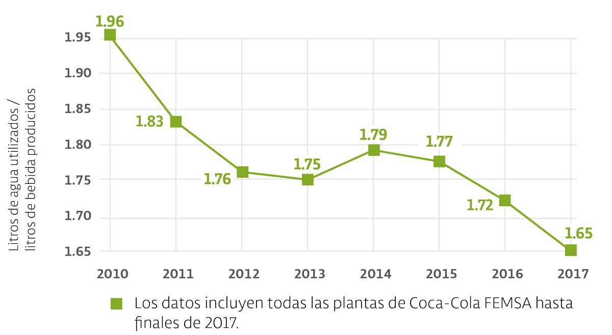 Debido a que la calidad y disponibilidad de agua resultan cruciales para la industria de bebidas, buscamos reducir su consumo, mejorar la gestión de su abasto y conservar las cuencas hídricas. Desde 2010, Coca-Cola FEMSA ha reducido de manera constante la cantidad de agua que utiliza para producir sus bebidas.