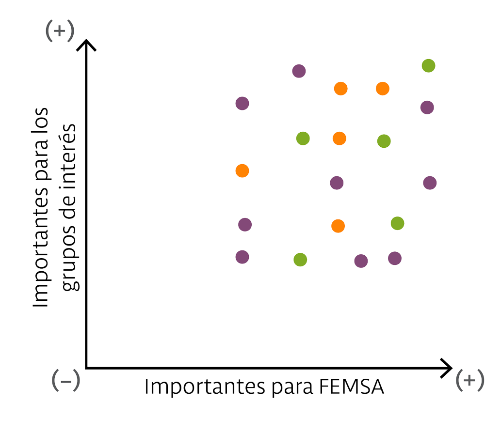 A partir de un extenso análisis de materialidad realizado por primera vez en 2012 —que incluyó un análisis de nuestra estrategia de negocio, los riesgos emergentes, las tendencias en la industria y las mejores prácticas— y el involucramiento directo de los directivos de las unidades de negocio de FEMSA y de representantes de grupos de interés externos, identificamos 19 temas de enfoque que corresponden a nueve áreas de acción relacionadas con nuestros tres pilares. Constantemente involucramos a nuestros grupos de interés para confirmar y actualizar nuestra evaluación de temas materiales. Debido a que cada unidad de negocio es diferente, decidimos realizar este análisis de materialidad por unidad de negocio. Iniciamos con Coca-Cola FEMSA, OXXO, Solistica, Imbera y PTM.
