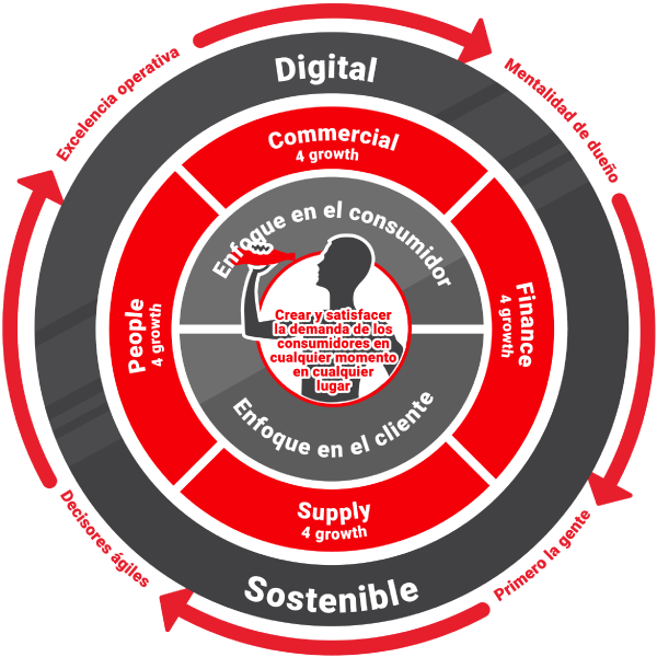 Commercial 4 Growth: Nuestra visión consiste en desarrollar capacidades digitales y operar modelos que generen mayor valor a nuestros clientes y consumidores. Para lograrlo, el objetivo es desarrollar ocho capacidades comerciales centrales: segmentación de mercado; gestión del crecimiento en ingresos; planeación de la demanda; ejecución comercial; ruta al mercado; servicio al cliente y acercamiento; analítica comercial y gestión de datos, y tecnología digital. Uno de los aspectos más destacados de estas transformaciones fue el lanzamiento de herramientas de aprendizaje automatizado y de análisis de perspectivas que ha aumentado considerablemente la precisión de nuestro pronóstico de demanda; así como nuestra herramienta Gestión Dinámica de Iniciativas en México, Brasil, Colombia y Argentina, lo que nos ha permitido identificar, priorizar y comunicar a nuestra fuerza de ventas iniciativas específicas dirigidas a nuestros clientes.
